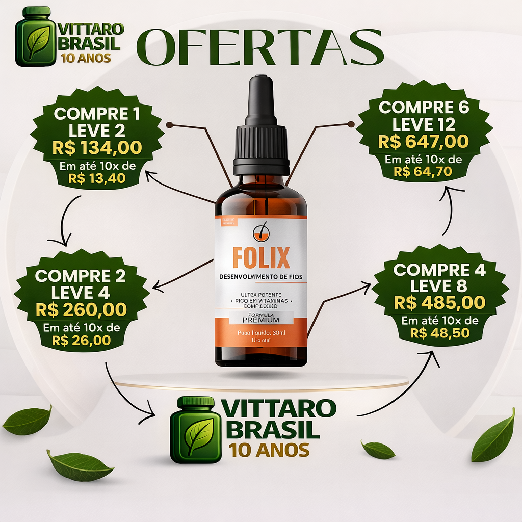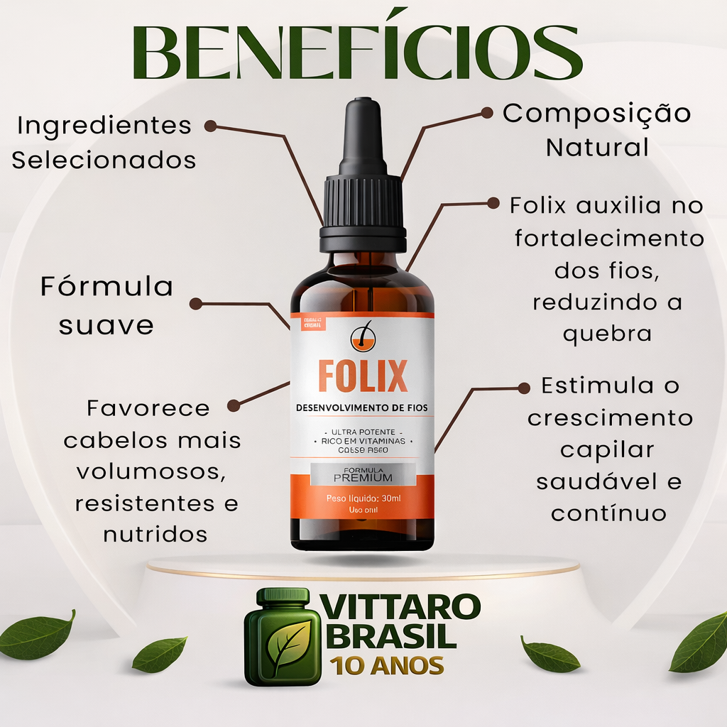 Folix é um suplemento capilar desenvolvido especialmente para fortalecer os fios e estimular o crescimento natural do cabelo. Ele atua de dentro para fora, fornecendo nutrientes que ajudam a manter os cabelos mais resistentes e cheios de vitalidade.